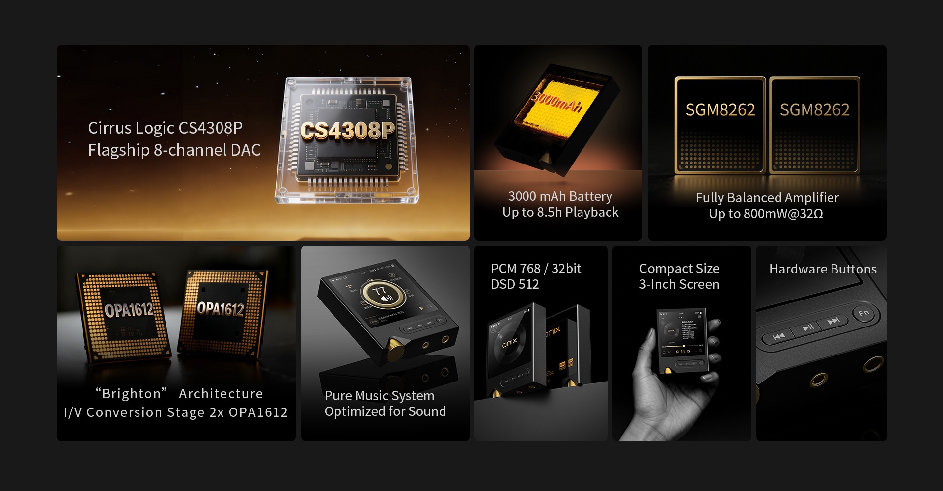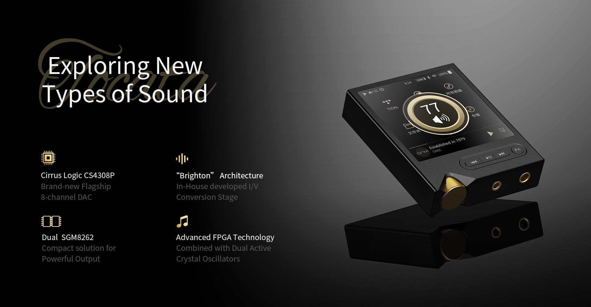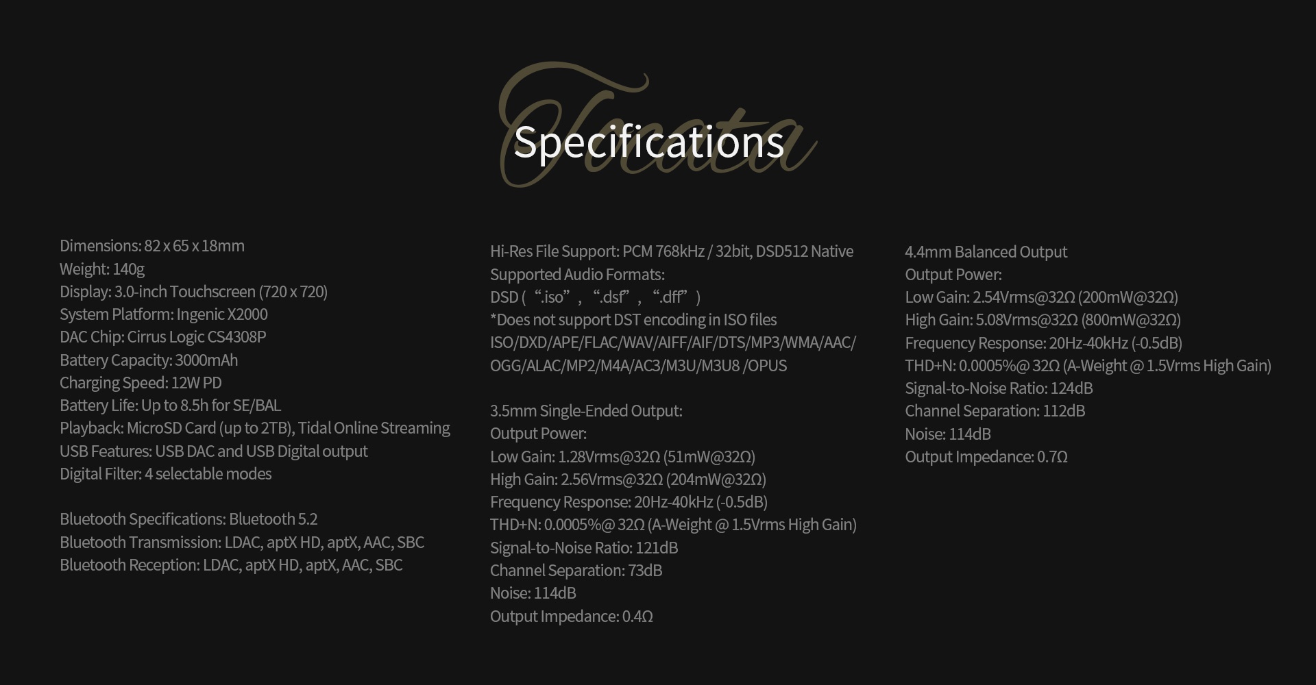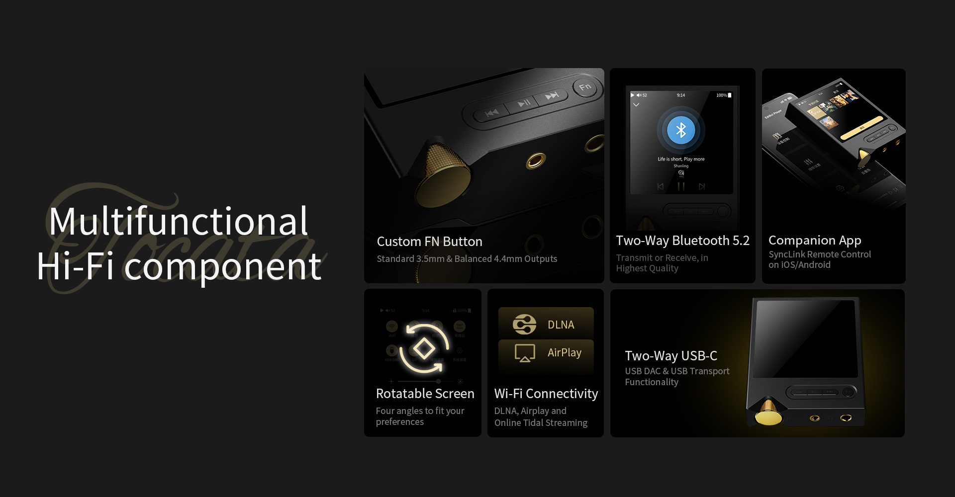 Sistema rápido y altamente enfocado, impulsado por la plataforma Ingenic X2000 y diseñado para los audiófilos más exigentes.Evitando las distracciones de los teléfonos inteligentes modernos y simplemente ofreciendo la experiencia musical central. Al reproducir archivos de alta resolución desde una tarjeta MicroSD, transmitir con Tidal o ejecutar a través de DLNA/Airplay, se garantiza un sonido ininterrumpido de alta fidelidad.
