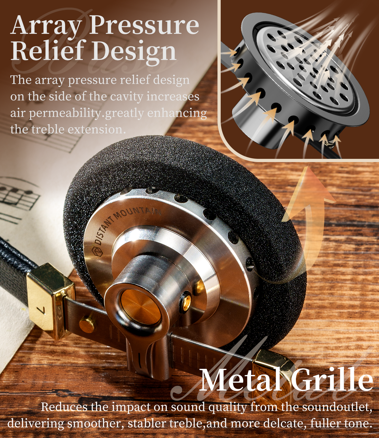 La rejilla metálica reduce el impacto en la calidad del sonido proveniente de la salida de audio, ofreciendo agudos más suaves y estables, y un tono más delicado y pleno. El diseño de alivio de presión lateral de la cavidad aumenta la permeabilidad al aire. Asimismo, la entrada de aire es varias veces mayor que la de los auriculares convencionales de gran tamaño, lo que mejora notablemente la extensión de los agudos.