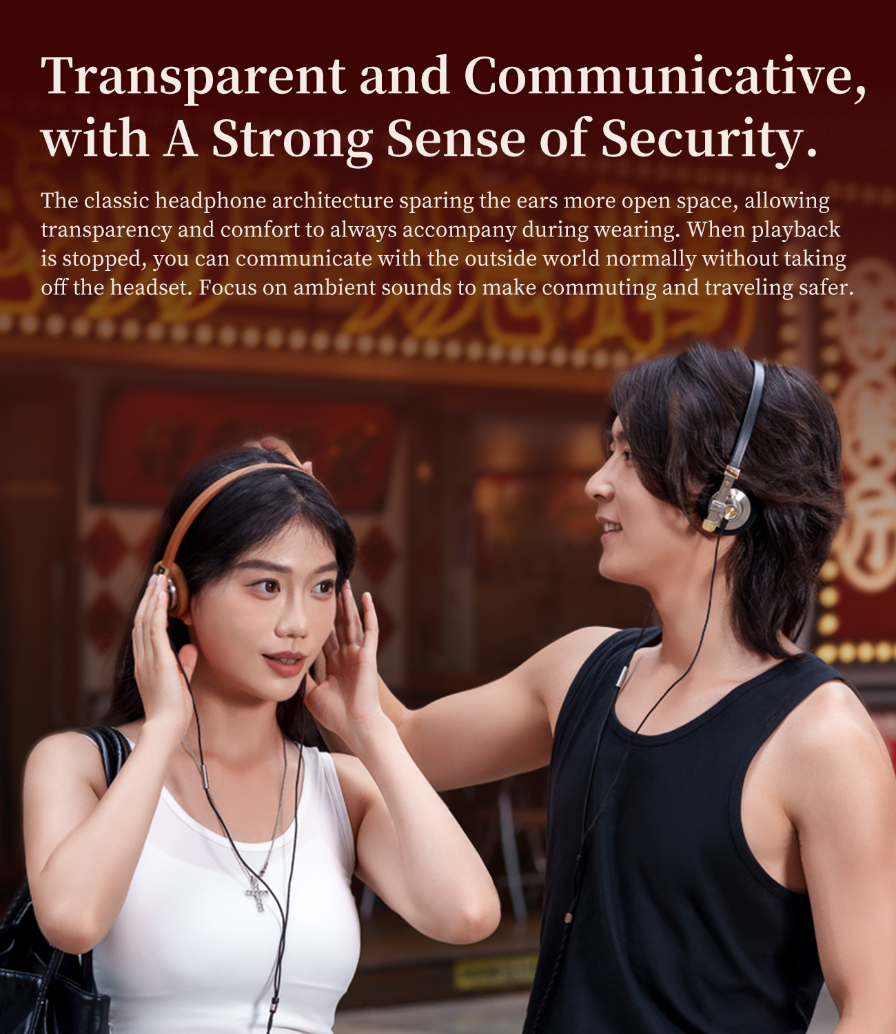 El diseño clásico de estos auriculares ofrece más espacio para los oídos, permitiendo una transparencia y comodidad constantes. Al detener la reproducción, puedes comunicarte con el exterior sin necesidad de quitártelos. Escucha los sonidos del entorno para que tus desplazamientos y viajes sean más seguros.